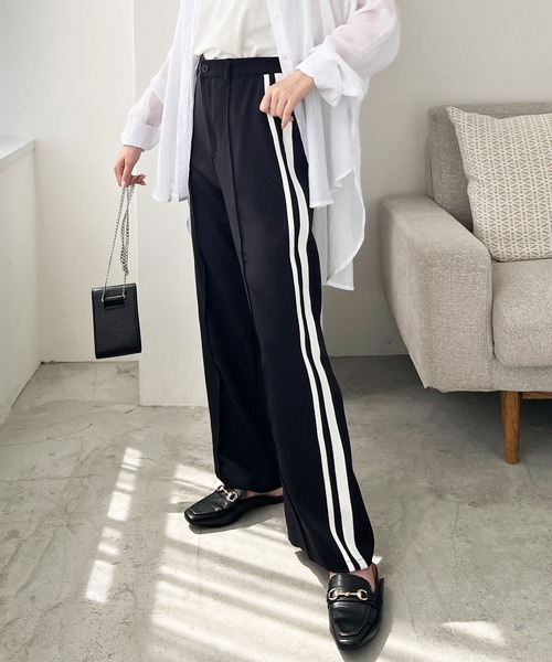 キレイめなスラックス×スポーティーなサイドラインの組み合わせで、大人カジュアルな印象に◎