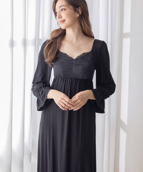 胸下からふんわりと広がるAラインでお腹周りもゆったりしているため、マタニティワンピとしても。