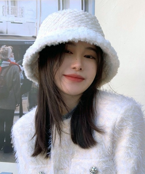 コーデのポイントになるもこもこバケットハット。立体感のある素材感が上品でおしゃれ。