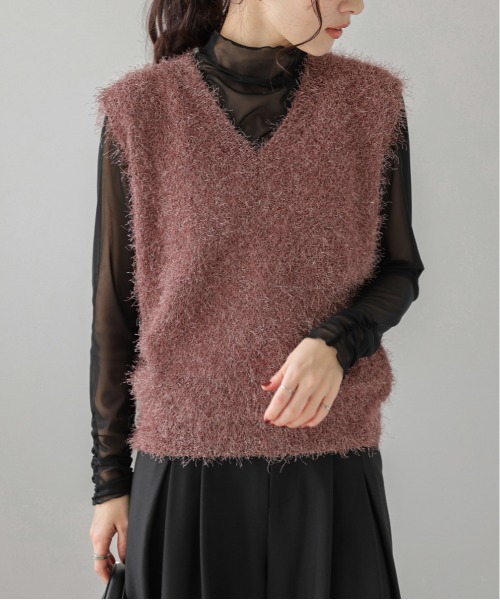 コーデにプラスするだけでオシャレ見え叶う。 ラメ入りで上品にきらめく華やかなニットベスト。ほど良くルーズなサイズ感で体型カバーにも◎レイヤードスタイルはもちろん、暑い日は1枚でも着られるデザインで、1年を通して長く使えます。