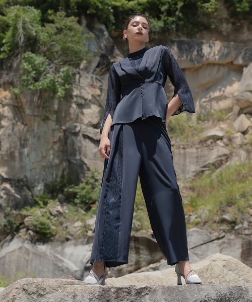 アシメレースパンツがこなれた着こなしを演出してくれるワイドパンツセットアップ