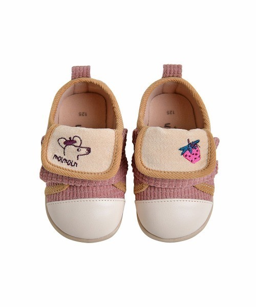 暖かい起毛が裏地に使われているメロディーシューズ。足の甲のかわいい刺繍がポイントで、カラー配色ラバーがカジュアルな印象のアイテム。ワッペンボア帽子(W234CAI03P)とのコーデがおすす