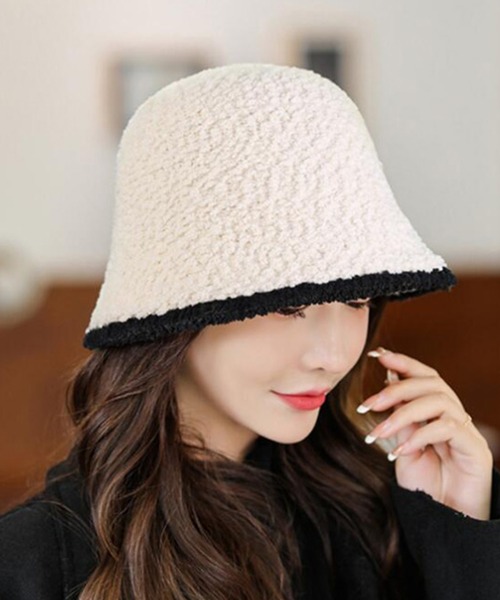 季節感のあるボア素材もこもこバケットハット。丸くてコロンとしたかわいいシルエットが魅力。