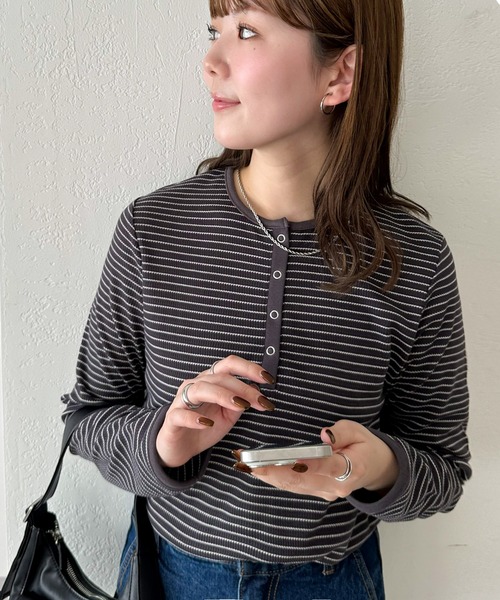 シンプルなデザインで大人カジュアルからきれいめまで幅広いコーディネートができるワッフル生地の長袖Tシャツ。細めのボーダーで華奢見えになり、襟元はヘンリーネックデザインで抜け感をプラス♪一枚で着るのはもちろんインナーとしても使え、使い勝手の良いアイテムです。