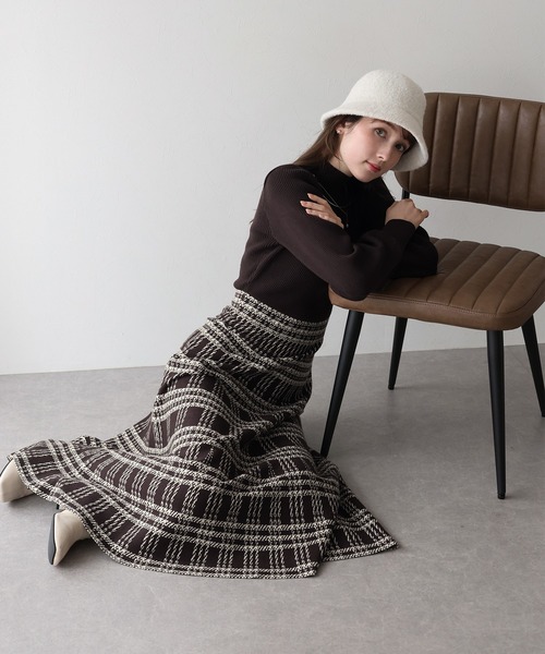 スカート部分にはスタイル良く見えるように拘った、裾に向かって柄が細かくなる縦長のチェック柄を編み立てました。