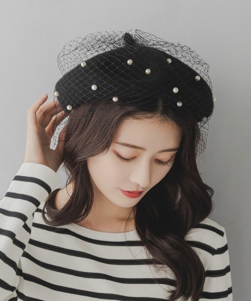 パール&チュールが華やかなデザインのベレー帽。