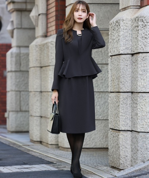 ジャケットとワンピースがセットになったブラックフォーマルスーツ。
