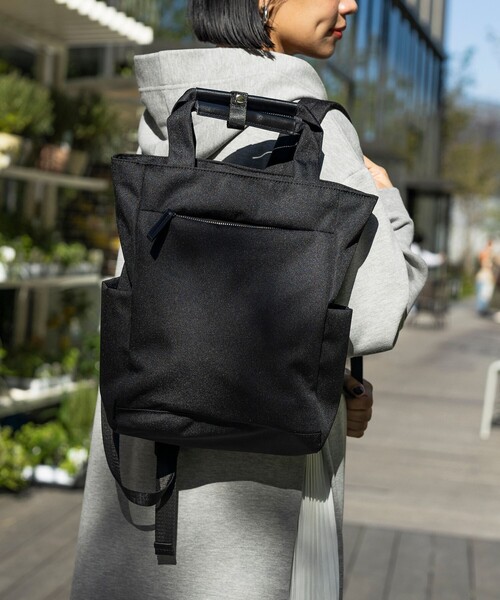 洗練された都会的なシルエットと、機能的なサイドボトルポケットがデザインポイント。混雑した電車内やカジュアル感を軽減したいシーンではトートバッグとして、アクティブな時はバックパックとしてと2WAY仕様が可能。