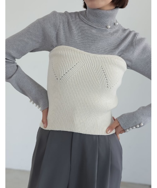 シャツやTシャツ、ワンピースに合わせるだけで、トレンドのコーディネートが楽しめるニットビスチェです。