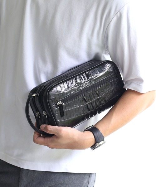 表面のナイルクロコダイルホーンバックがワイルドな印象のセカンドバッグ。
