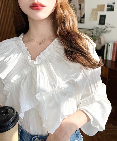 ・フロントにクロスにあしらったたっぷりフリルがポイント。オフショルで着てもフリルが広がってまたシルエットが少し変わった印象に◎