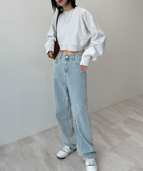 定番のデニムにパールがついた大人かわいいパンツ。