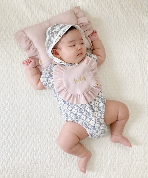 寝ている赤ちゃんのお顔周りのフリルが可愛らしさを引き立てます。