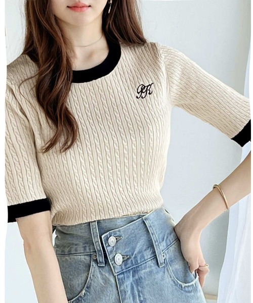 さらりとした肌触りが特徴のケーブル編みニットに、ワンポイント刺繍を施しレトロかわいい1枚に仕上げました。