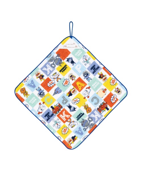カラフルなスクエアの中にアンパンマンやばいきんまん・だだんだん・どんぶりまんトリオなどたくさんのなかまたちがデザインされたループ付タオル♪