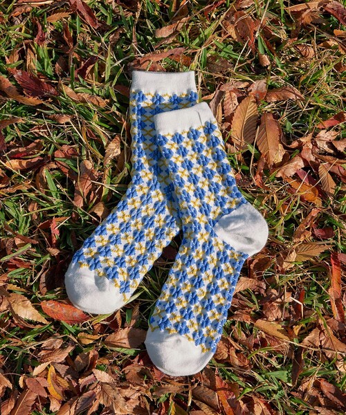 立体的に見えるジャガード編みの幾何学柄が印象的なソックスです。