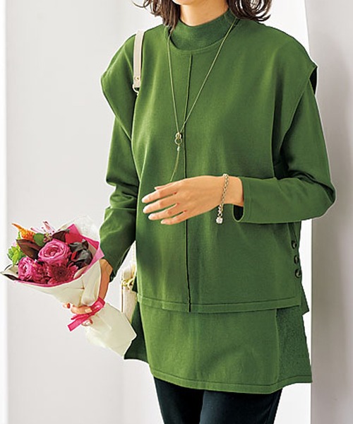 サイド釦がアクセントのベストと、編地切替チュニックのセット。