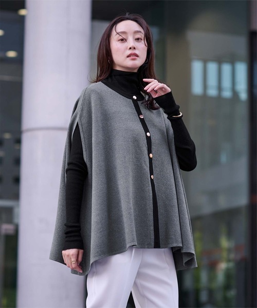 上品で大人の女性らしさを引き立てる、ゴールドボタンがアクセントのケープニットカーディガン。
