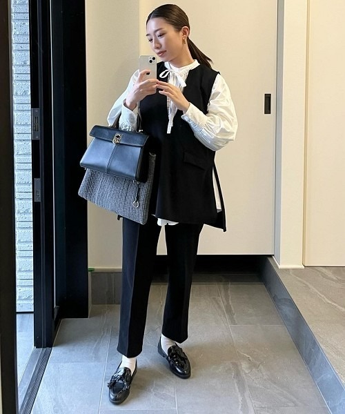 冬:単品使いのスタイリングがおすすめ!ベストはニットやシャツと重ね着してアウター合わせも着ぶくれせずOK!