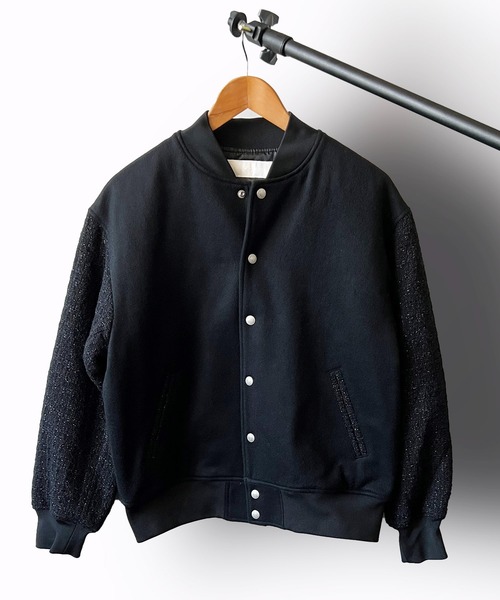 スタジャンのようなデザインベースでありながら、袖をツイードに切り替えることによって、