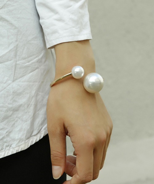 大きなパール付きのゴールドバングルはエレガントで華やかな手元にしてくれます。