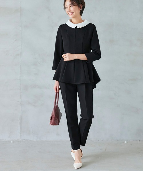 [2WAY]パール付け襟タックフレアトップス+シークレットゴムパンツセットアップ