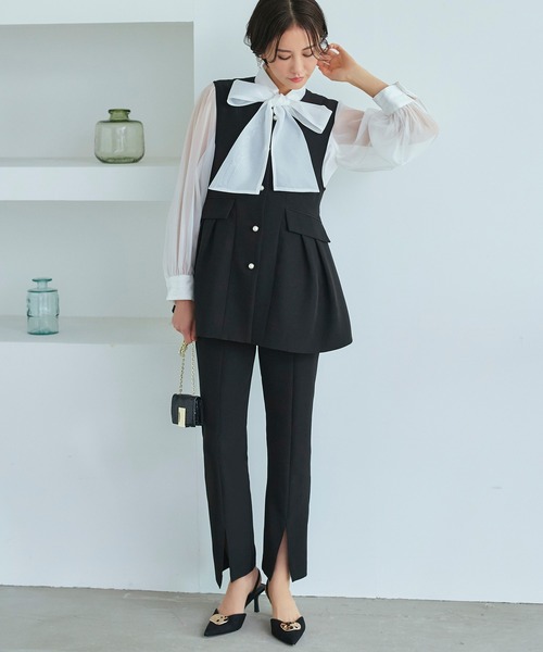 パールをアクセントにした綺麗シルエットジレとスリムストレートパンツのセットアップ。ハレの日には、華やかなブラウスをプラスして端正で気品あふれる佇まいに。