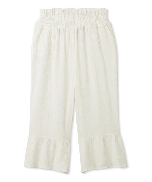 季節を問わず着用いただける、風合い豊かなダブルガーゼを使用したマタニティシリーズ。幅広のシャーリングゴムのウエストが、お腹を柔らかく包むロングパンツです。脇ポケット付きのゆったりストレートシルエットは動きやすく、フリル裾の切り替えがキュートな印象。色はピンク、チャコールグレー、オフホワイト、ミントの豊富な4色展開。同素材のプルオーバーとコーディネートしたり、入院着やギフトにもおすすめです。