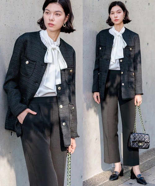 【ツイードジャケット+ボウタイブラウス+ストレートパンツ】