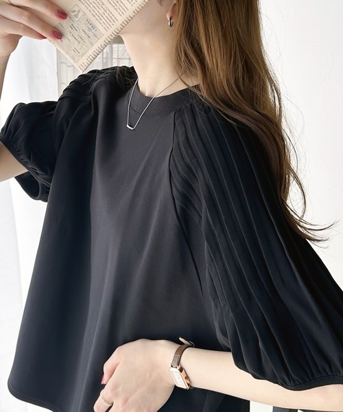 タックの入ったバルーンスリーブが特徴的なTシャツ。