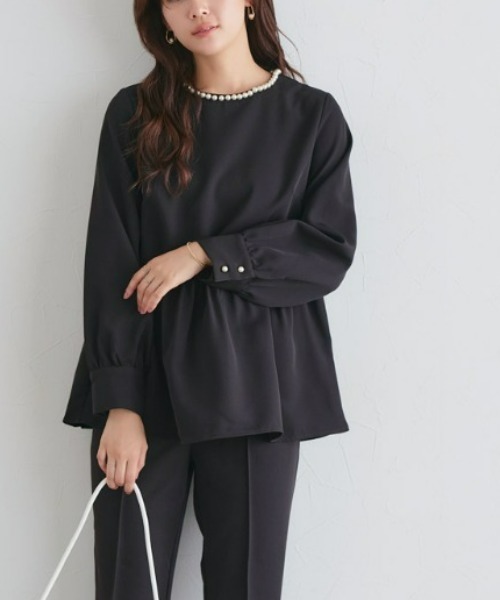 トップスは衿のパールがアクセ要らずで華やかなデザイン。女性らしいペプラムシルエットは体型カバーにも◎パンツはセンターのピンタックがスタイル良く見せてくれ、ベーシックで着回しやすいデザインに。