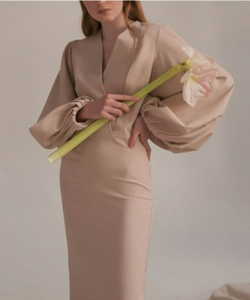 ラインの美しいドレスワンピース 胸元はVネックでレディライクにスリーブはボリュームスリーブでフェミニンに・・