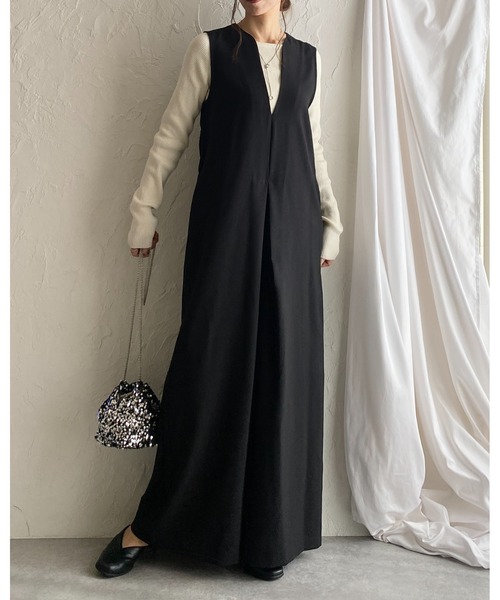 フロントのざっくりと深いキーネックデザインと、股下にたっぷりとタックデザインを入れることで、単調にならないこなれたシルエットを表現♡