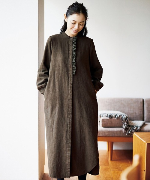 起毛加工をほどこしたツイル生地で仕立てたワンピースは、前立てにフリルを配しアクセントをつけました。