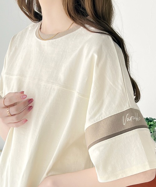 メンズライクなオーバーサイズで仕上げた配色リブライン刺繍ロゴフットボールTee。