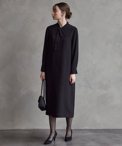 胸元のリボンタイデザインがポイントのブラックフォーマルワンピース。