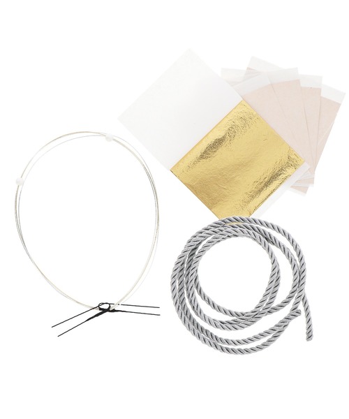 1.金・・・ゴールドのロープ状の紐飾り。白のコットンパールが通されたゴールドとシルバーの水引飾り。ゴールドの金箔シート。