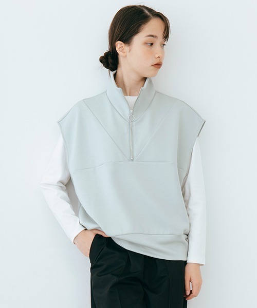 ZIPの上げ下げで印象を変えられるベストとロンTのセットです。ハイネックやインナーをちらっと見せた着こなしなど、その日の気分でスタイリングをアレンジできるのが魅力。スリーブレスで長袖と半袖を季節に合わせて使い分けられるのもポイントです。インナー用のロンTは無駄のないシンプルなデザインにこだわりました。ベストは両側にポケットつきです。【透け感】透けない【生地の厚さ】普通【伸縮性】あり【裏地】なし【ポケット】あり※ベスト(両脇)ポケットあり