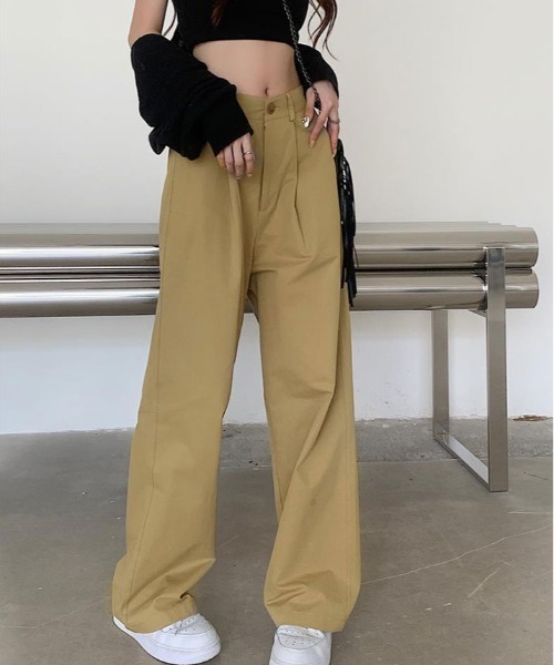 ・ゆるすぎず女性らしく着用できるハイウエストデザインのワイドチノパンツ。