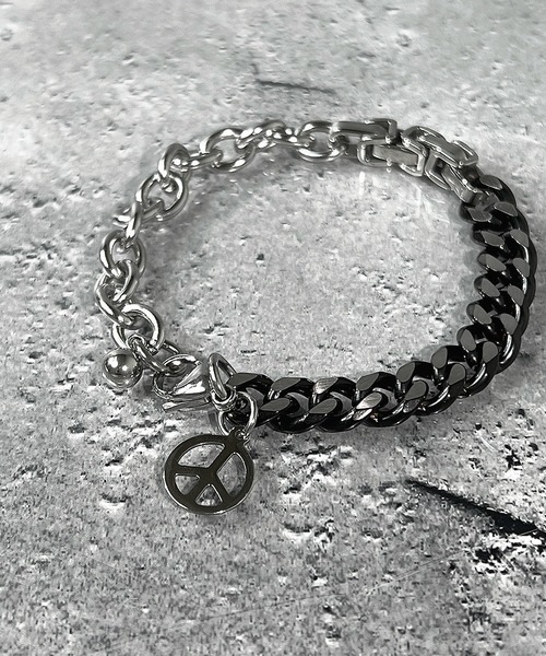 複雑に組み重なったチェーンが印象的で手元コーデのアクセントに◎揺れ動くボールやピースマークパーツもさりげないおしゃれポイント。