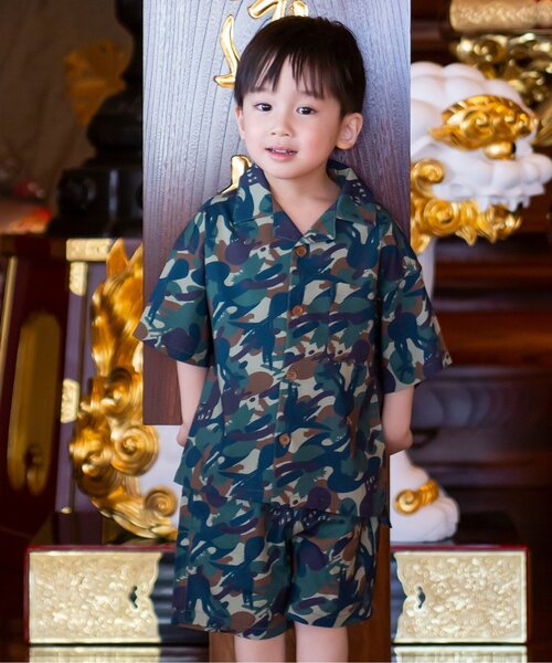 今回のコラボの為に描き下ろしたインパクトある迷彩柄を柔らかいツイル素材にプリントしたセットアップ。