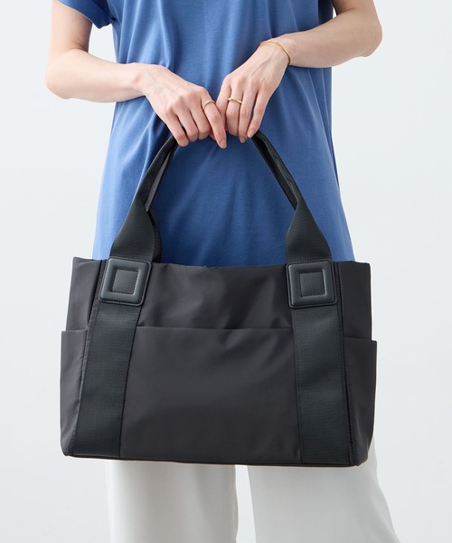 汚れてもお手入れしやすい素材がうれしいポイント、持ち手のレザー使いがアイテムを引き締めるポイントです。