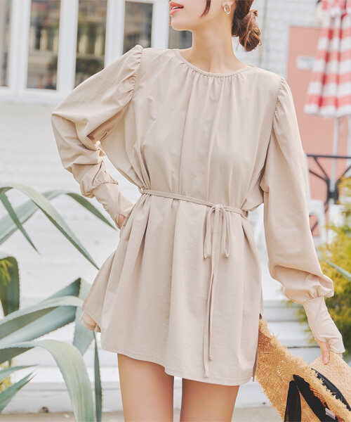 ゆったりシルエットで体型を気にせず着用でき、セットの本体同生地のリボンでウエストブラウジングすればスタイルアップ見えも叶います。