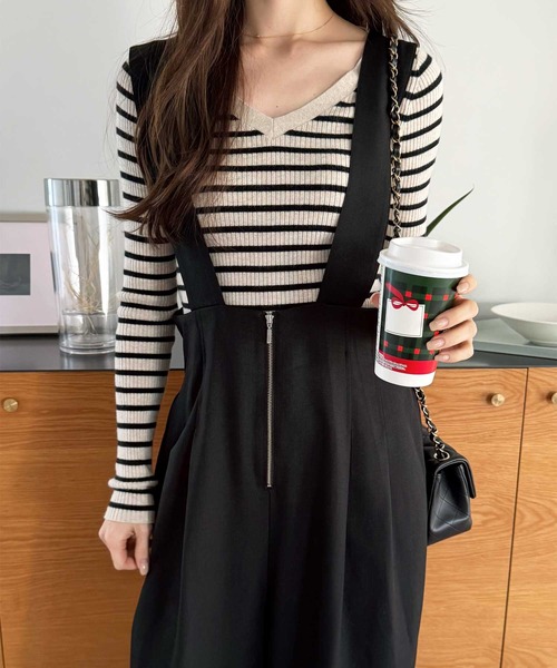 ハイウエストのワイドサロペットで美脚見え!