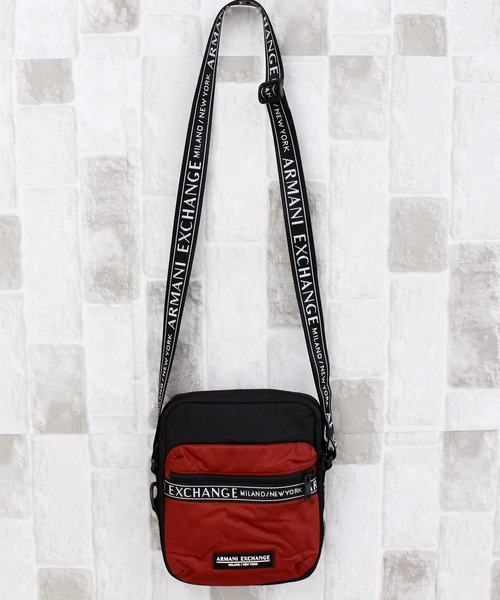 フロントのパッチ、バンド、ショルダーストラップに「RMANI EXCHANG MILANO/NEW YORK」ロゴを大胆にデザインしたバッグ。