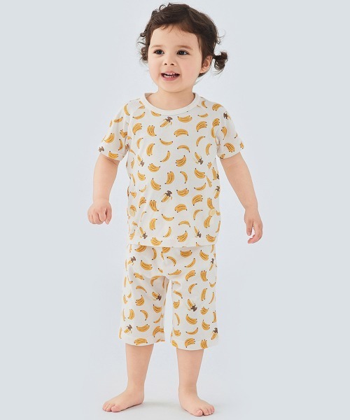 かわいらしいバナナが全体にちりばめられ、バナナの皮をむくと、なぜか中から何とも言えない表情のイヌがあらわれるというユーモアあふれる柄。着るだけで楽しい気分になり、生地はなめらかな薄手の綿素材なので、肌触りもよく心地よく寝られそう。トップスはボタンのないラクチン被りタイプでカンタンにお着替えできます。