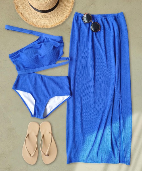 クロスに掛けるアシンメトリーのストラップがアクセントを効かせるセット水着。