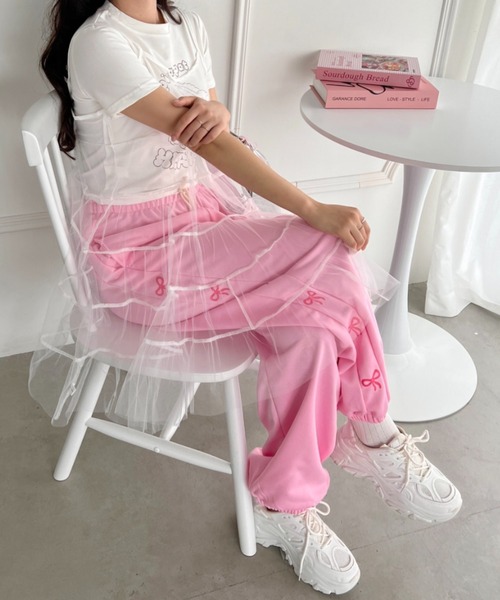 リボンデザインが目を惹く、裾ゴム入りのゆるっとシルエットのスウェットパンツ。