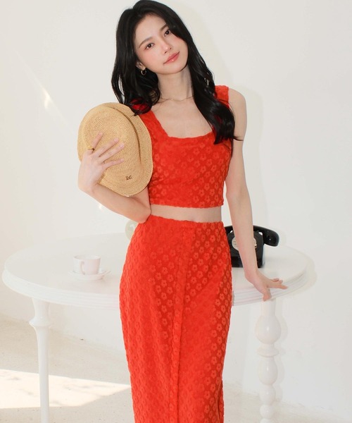 同生地のロングスカートは程良くボディラインを沿うシルエットになっており、縦のラインを強調。