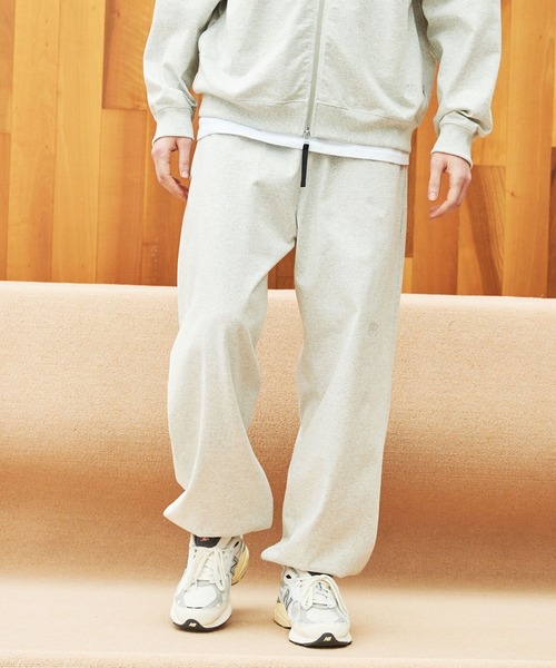 ベーシックで使いやすいスウェットパンツ。ファスナー付のポケットやさりげなく入った左膝の刺繍もポイント。